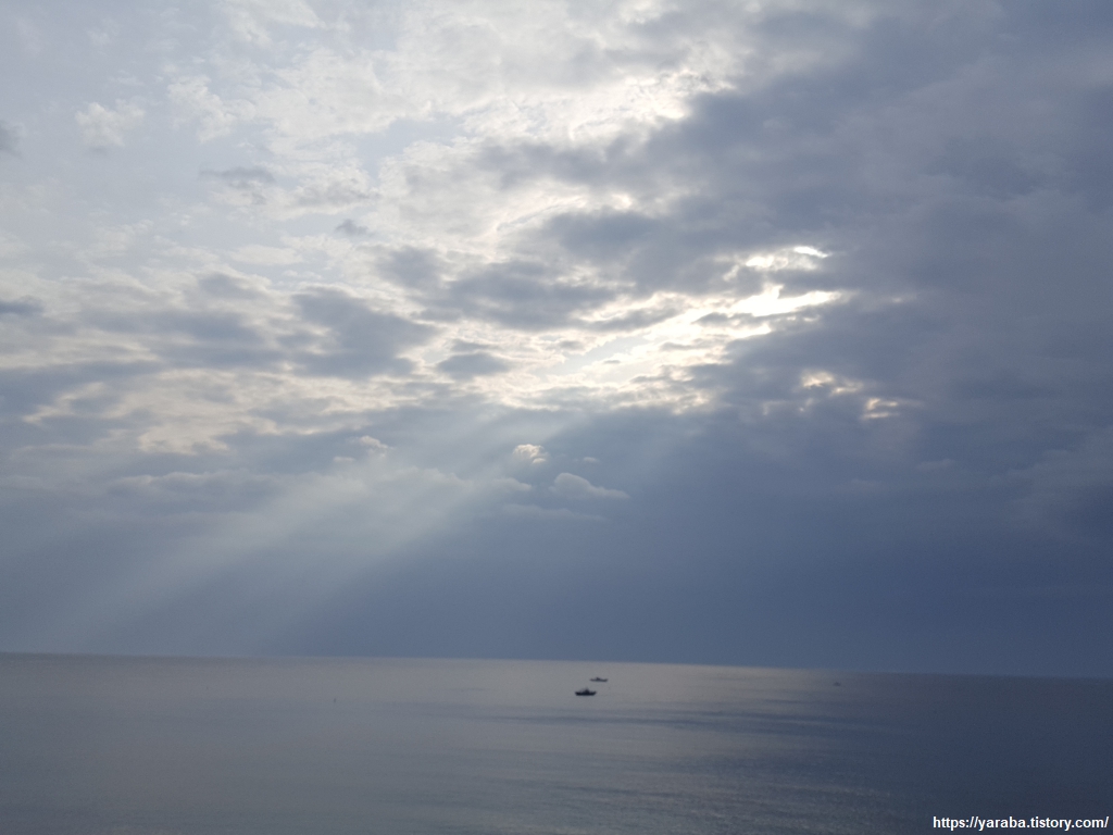 뒤를 돌아보면 구름 사이로 들어오는 태양빛이 잔잔한 바다 위를 비추며 절경을 빚어낸다. 해파랑길을 걸으며 한번 지나치기에는 정말 아름답다.