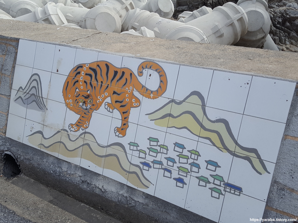 오산 2리와 호랑이가 무슨 연관이 있는지 쉼터에도 방호벽 벽화에도 호랑이가 등장하는데 마을 설명 자료에도 연관 자료는 없었다.