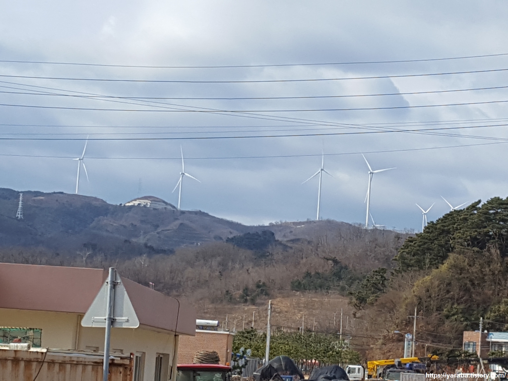 오산항 뒤쪽을 보니 현종산 일대에 설치된 풍력 발전기들을 아주 가깝게 볼 수 있었다.