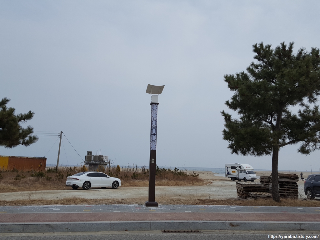 쭉쭉 뻗은 소나무 가로수와 함께 염전 해변의 산책로를 걷는다. 널찍하고 잘 정비된 길이다. 염전 해변으로 들어선 캠핑장을 벗 삼아 걷는 길이다.