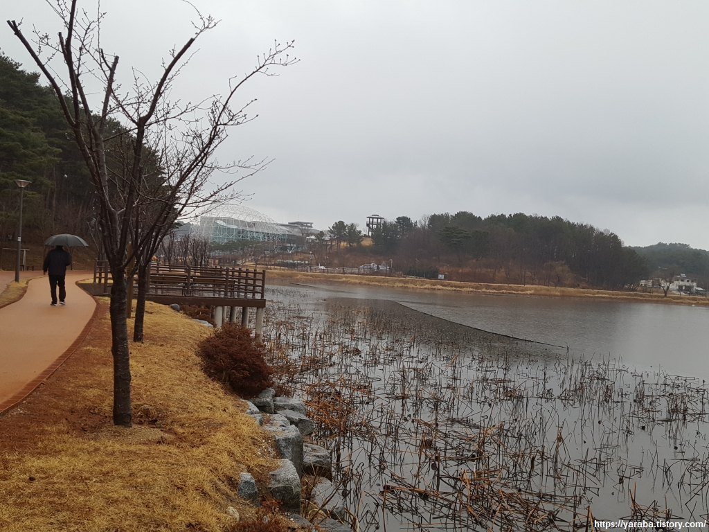 이른 아침, 비 오는 날씨에도 불구하고 우산을 들고 연호 공원을 산책하는 사람들이 많았다.