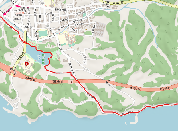 연호 공원 건널목에서 바라본 울진군 의료원의 모습. 경북에서는 포항, 김천, 안동과 함께 울진에 의료원이 위치해 있다. 지역 어르신의 필요를 감안한 까닭인지 많은 버스 노선이 울진군 의료원을 거치도록 되어 있었다. 바로 옆으로 7번 국도도 있으니 인근 주민들에게는 접근성이 좋다.