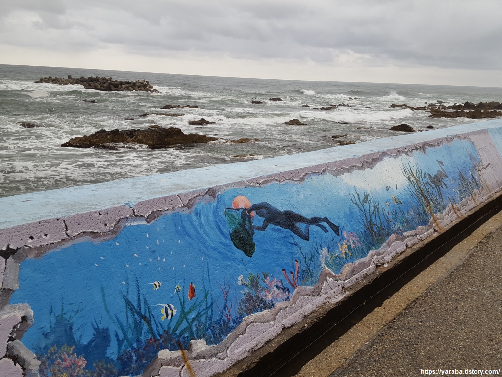 대나리항으로 가는 길의 방호벽 벽화는 미술관 수준이다. 보슬비 속에서 아름다운 바다와 어울리는 환상적인 그림들을 감상하는 재미를 준다.
