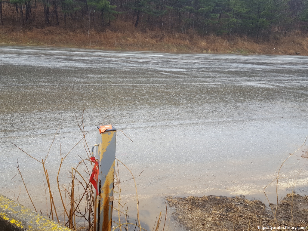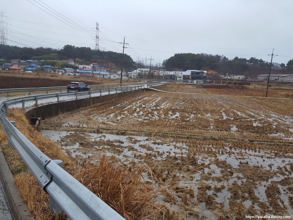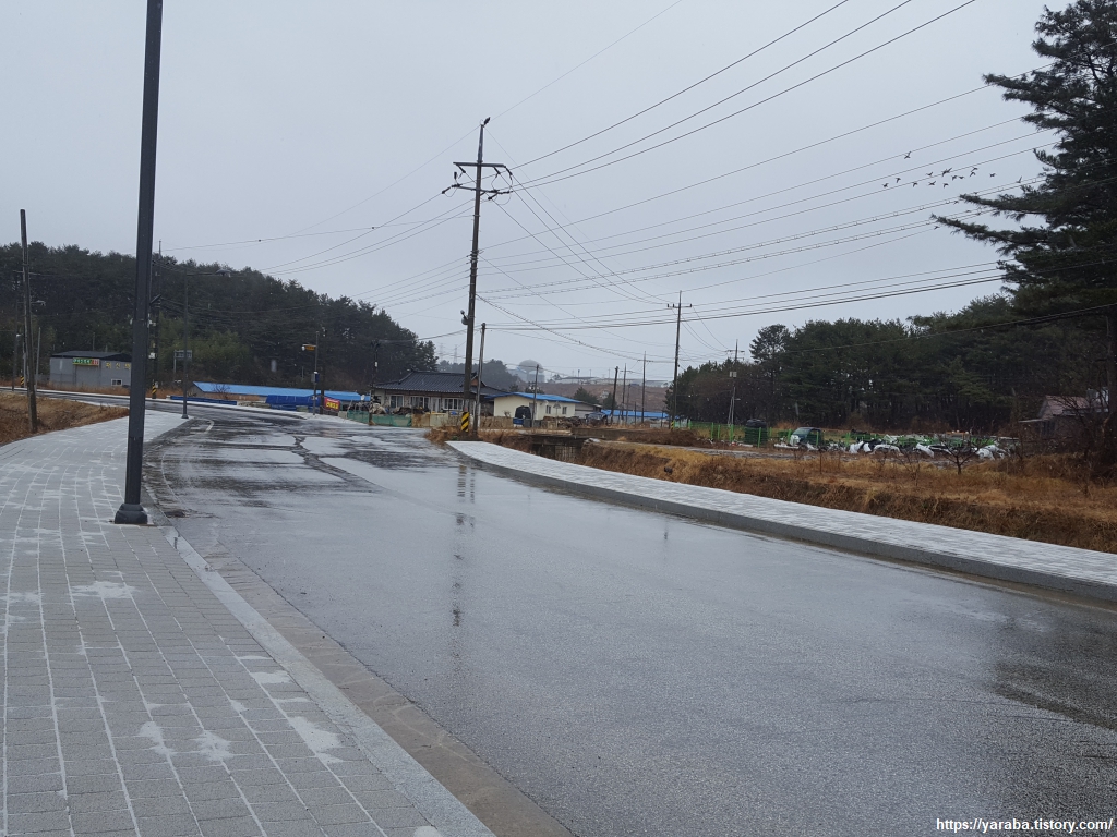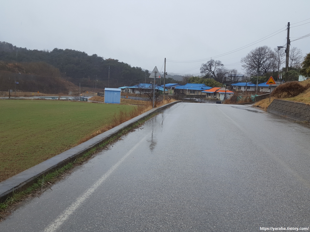 후정 2리 쉼터에서 배낭을 내려놓고, 우비도 벗고 넉넉한 휴식 시간을 갖는다. 눈이 섞여서 내리는 차가운 겨울비 탓에 배낭 속의 외투를 꺼내어 입을 수밖에 없었다. 오들오들 거리며 준비해온 김밥을 먹었지만 따뜻한 커피는 모든 것을 녹여 주기에 충분했다.