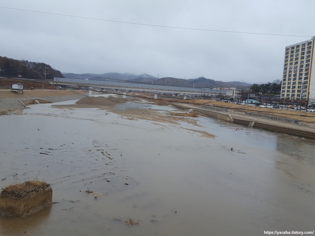대정교를 지나 좌회전하여 하천변을 걷는다. 7번 국도와 이어지는 후정 IC 교 아래를 지나 하천변을 계속 걷는다. 이제부터는 북면 고목리를 걷는다.