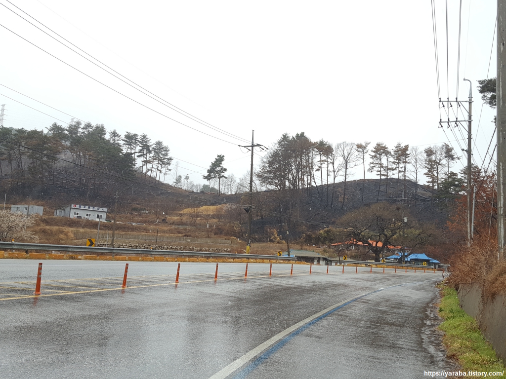 울진북로 도로변을 걷지만 자전거 도로 덕분에 보행로를 확보할 수 있어서 그나마 다행이다. 안타까운 것은 정면으로 보이는 시커멓게 타버린 산과 나무의 모습이다.