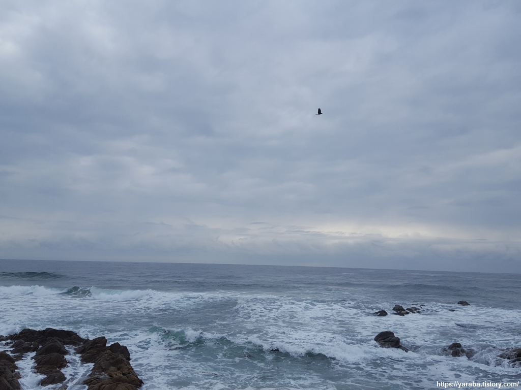 비가 내렸던 어제의 거친 파도가 오늘도 이어지고 있지만 바다 위로 날아가는 물새 한 마리가 겨울 바다의 정취를 더해준다.