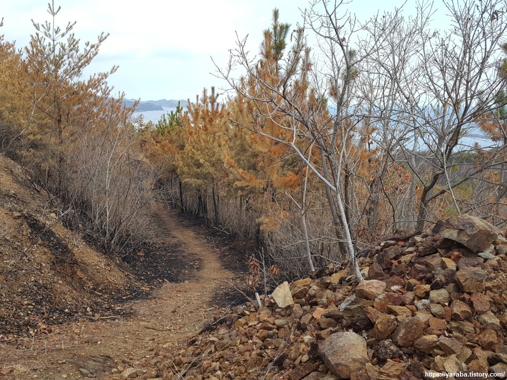 완만한 내리막이 이어지는 산책길. 비가 내리고 봄이 오면 시커먼 바닥에서 풀들이라도 조금씩 자라 주었으면 하는 바람을 가져 본다. 불탄 흔적에 마냥 기분이 좋은 것은 아니지만 완만하게 내려가는 숲길은 걷기에 좋은 길이었다.