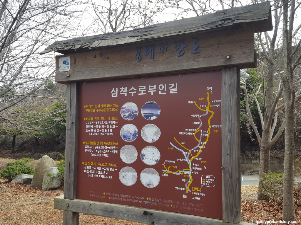 삼척 수로부인 길, 관동대로 수로부인 길은 해파랑길과 상당 부분 같이 간다. 수로부인 이야기는 삼국유사를 통해 내려오는 설화로 헌화가와 해가의 주인공이지만 역사와 실화 속의 인물도 피부에 와닿지 않는데 설화의 주인공이야...... 아무튼 좋은 숲길에 붙인 이름이 삼척 수로부인 길이라니 그러려니 할 뿐이다. 수로부인 이야기는 동해안 특히 삼척과 동해, 강릉에서 자주 만나는 이야기가 될 것이다. 수로부인을 두고 별의별 해석이 있지만 설화는 설화일 뿐 이상한 살은 붙이는 것은 영 달갑지 않다.