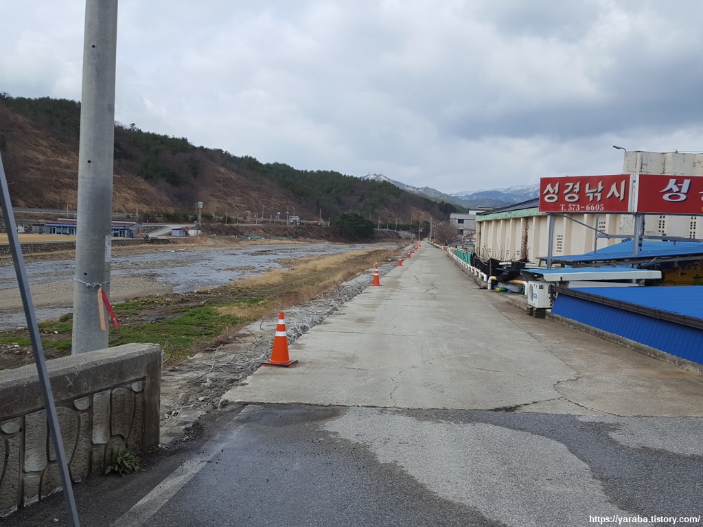 어제 건너왔었던 호산천을 따라서 호산천변을 걷는다. 멀리 하얀 눈을 쓰고 있는 태백산맥 준령의 모습을 보니 지금 히말라야를 걷는 것 아닌가 하는 상상을 하게 된다.