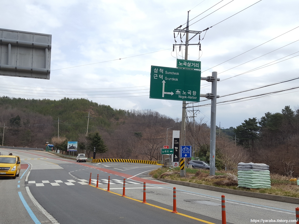 수릉 삼거리에서 오르막으로 직진한다. 우측 벽 뒤 언덕으로는 삼척 발전 본부가 자리하고 있다. 오르막을 계속 걸으면 노곡 교차로에서 7번 국도를 만나는데 해파랑길은 교차로 아래를 통해서 노곡리 방향으로 이동한다.