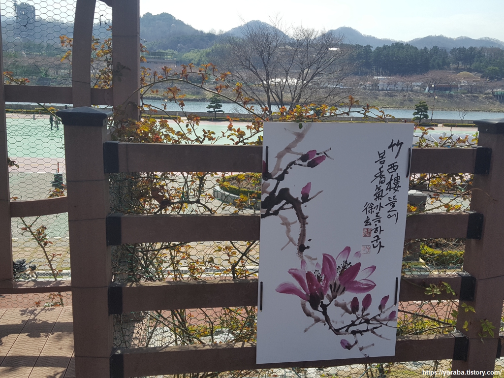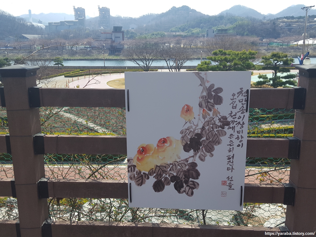 벚꽃길에서 열기고 있던 작은 시화전도 나름 볼거리였다. 그중에서 눈에 들어온 두 작품. "죽서루 뜰에 봄 향기가 가득하구나", "천만 송이 장미향이 오십천가에 은은히 퍼진다"라는 작가의 말이 공감이 되는 풍경이었다.