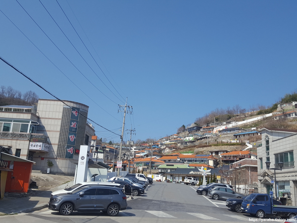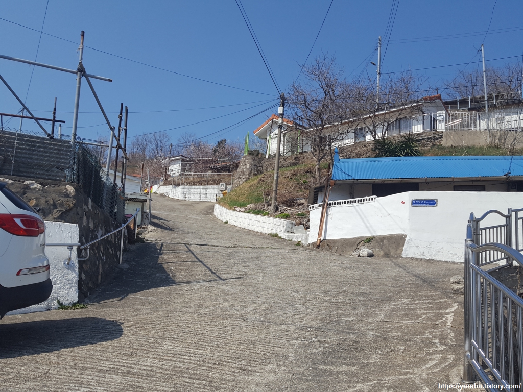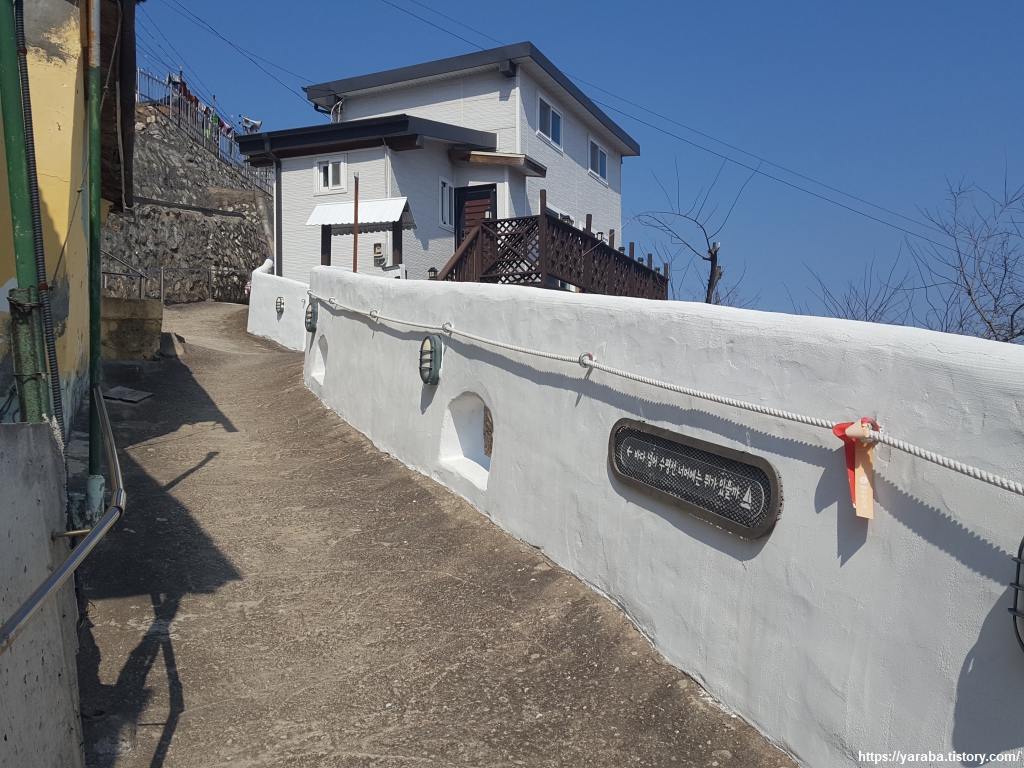 전망대를 떠나 계속 오르막을 오른다. 길을 걷다가 어떻게 이런 곳까지 차를 가져올 수 있을까? 하는 생각을 했지만, 과거 경사진 곳에 자동차를 세우며 돌을 괴어 놓던 기억이 떠오르며 이곳이나 저곳이나 사람 사는 것은 오십 보 백보라는 되뇜을 하게 된다. 어디에 사는지, 어떻게 사는지가 중요한 것이 아니라 , 당사자가 행복하고 평안한 것이 최고 아니겠나? 다만 어르신들은 과연 하얀 담벼락에 매어 놓은 밧줄을 사용하실까? 하는 쓸데없는 궁금증을 흘려보낸다.