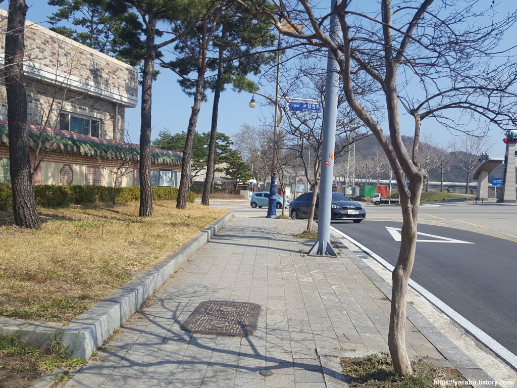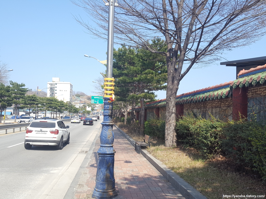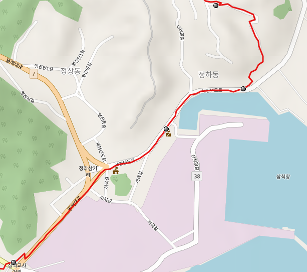 삼척교 앞 사거리는 7번 국도가 지나가는 큰길이므로 조심해서 길을 건너야 한다. 길 우측의 담장이 한옥처럼 고급스러운데 사실 이곳은 시멘트 공장의 연관 시설이 있는 곳이다. 울산에서도 공단 지역을 해파랑길이 지나야 했었는데 그곳도 담벼락에 담쟁이를 심어서 비록 공단이지만 삭막함을 줄이려는 노력을 하고 있었다. 지나친 낭비만 아니라면 이런 노력은 권장할만하다.