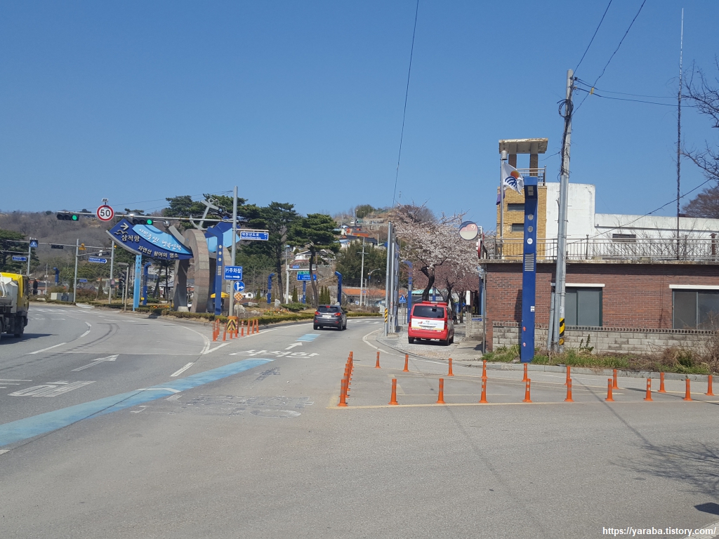 정라 삼거리에서 우회전하여 삼척항으로 진입한다. 이곳은 벚나무를 가지치기해서 나무가 조금은 앙상해 보이기는 하지만 그럼에도 아름다운 벚꽃을 선사해주는 길이다.