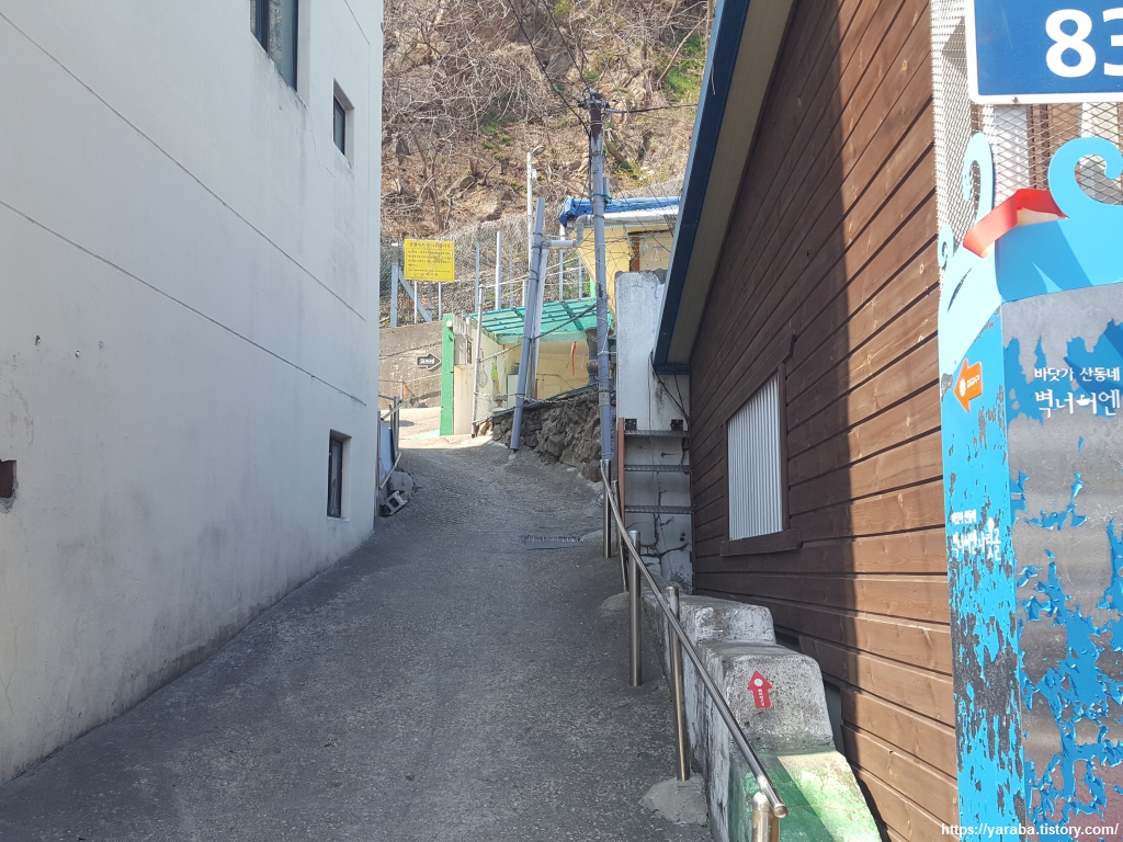 누군가에게는 그저 평범했을 콘크리트 골목길. 내가 자연스럽게 허리를 굽힐 수밖에 없는 노인의 때를 상상하게 한다. 줄을 붙잡고 한걸음 한걸음 오르막을 오르다가 잠시 한숨 쉬어갈 요량으로 허리를 폈는데 눈에 가득히 들어오는 동해 바다. 바다 같은 마음을 가진 노인이 되고 싶다.