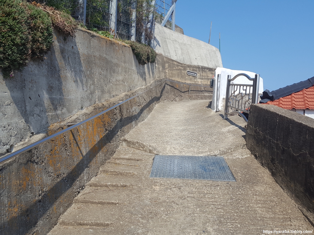 마치 선박 내를 걷는 느낌을 주는 하얀 담벼락 길. "수평선 너머에는 뭐가 있을까"하는 문구도 감성을 자극하기에 좋지만, 선박에서 사용하는 조명과 담에 매어 놓은 견인줄은 마치 선박 내부를 조심스럽게 걷는 상상을 하게 한다.