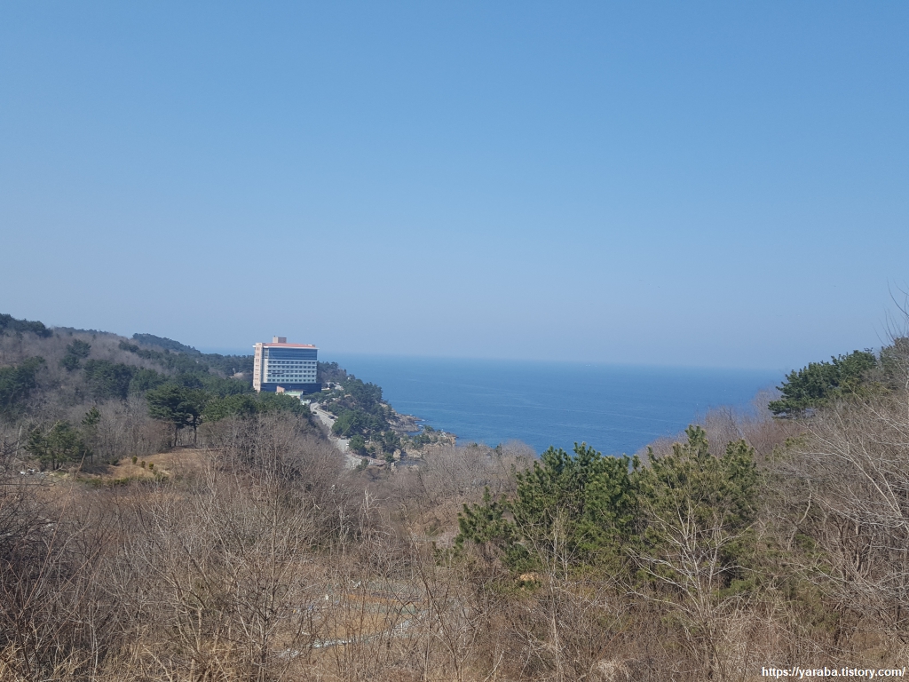 멀리 전망 좋은 곳에 위치한 건물 하나는 삼척 펠리스 호텔이다. 오랜 기간 방치되고 있는 건물이다. 2002년 동굴 엑스포를 열면서 행정기관은 너무 쉽게 허가를 내주었고 지금은 거의 방치 상태라 한다. 차를 몰며 지나면 인근에 건축하다가 중단되어 흉물처럼 방치된 다른 숙박시설도 있다. 절경을 가진 곳인데 안타까운 마음이다. 하긴 높은 곳에서나 보이지, 인근 도로를 지나면서는 현 상황을 인지할 수도 없다.