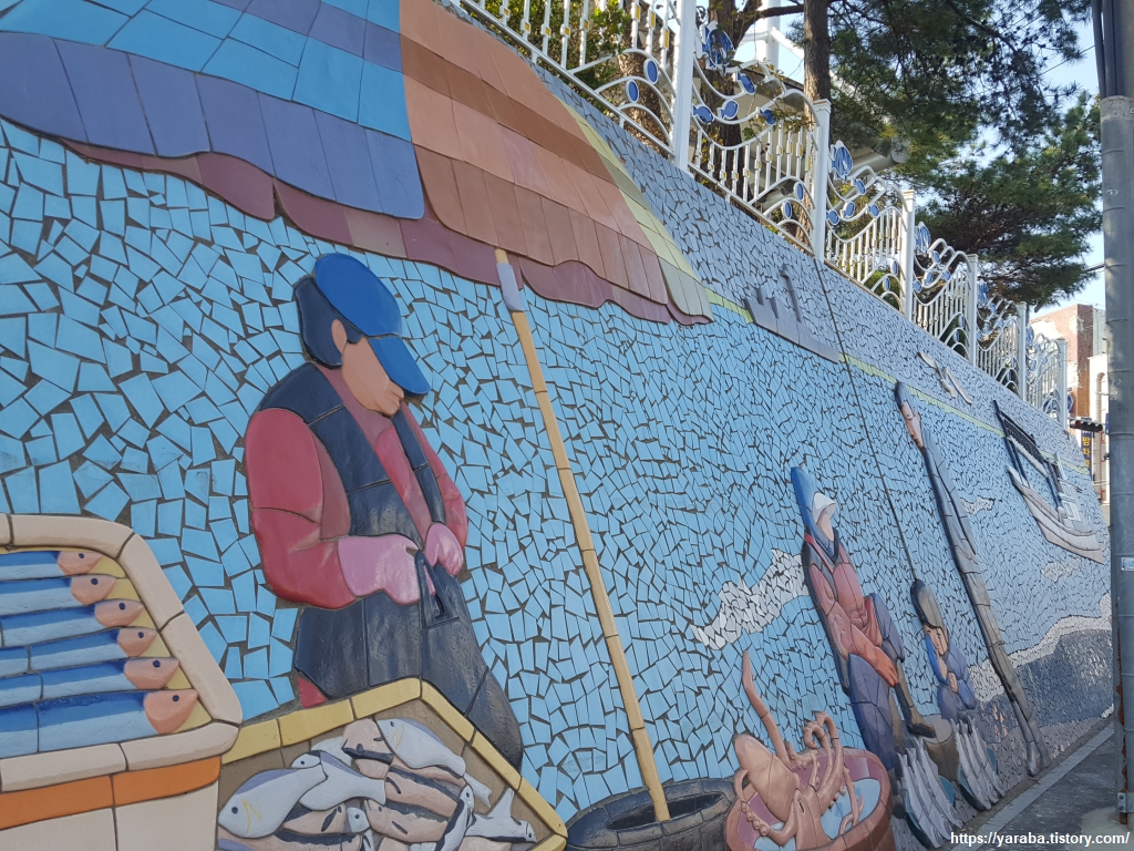 묵호역에서 역사 뒤편 해파랑길 시작점으로 이동하는 길에서 타일 벽화. 시장 풍경을 부조 만들어 놓았는데 훌륭한 작품이다.