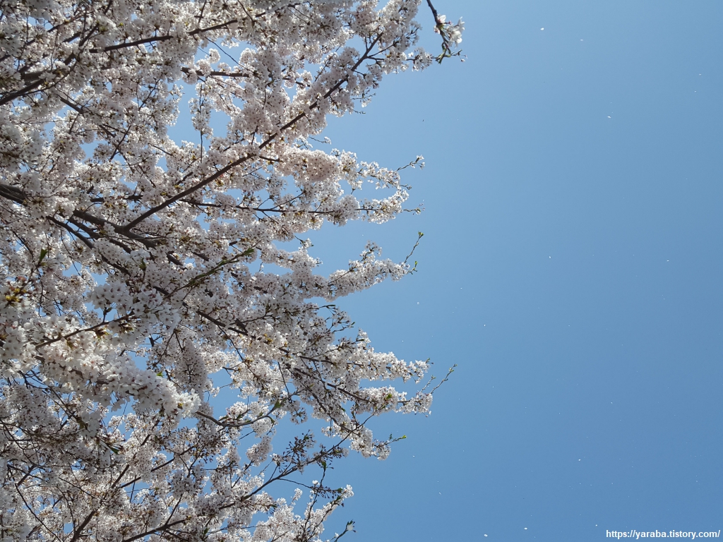 구름 한 점 없는 새파란 하늘과 새하얀 벚꽃이 강렬하게 내리쬐는 정오의 햇빛과 어우러져 환상적인 풍경을 선사한다.