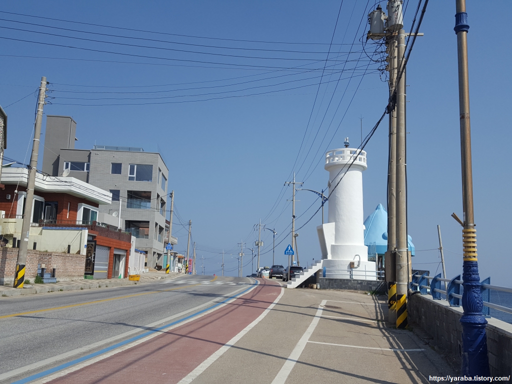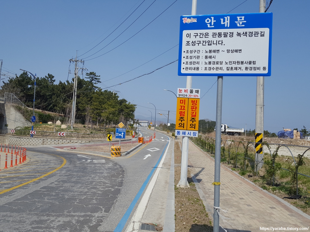 사실 대진 해변에서 노봉 해변을 거쳐 망상 해변까지 갈 수도 있지만 해파랑길은 대진 해변으로 들어가지 않고 모래 해변 뒤쪽으로 철로를 따라 이어지는 일출로 도로변을 걷는다.