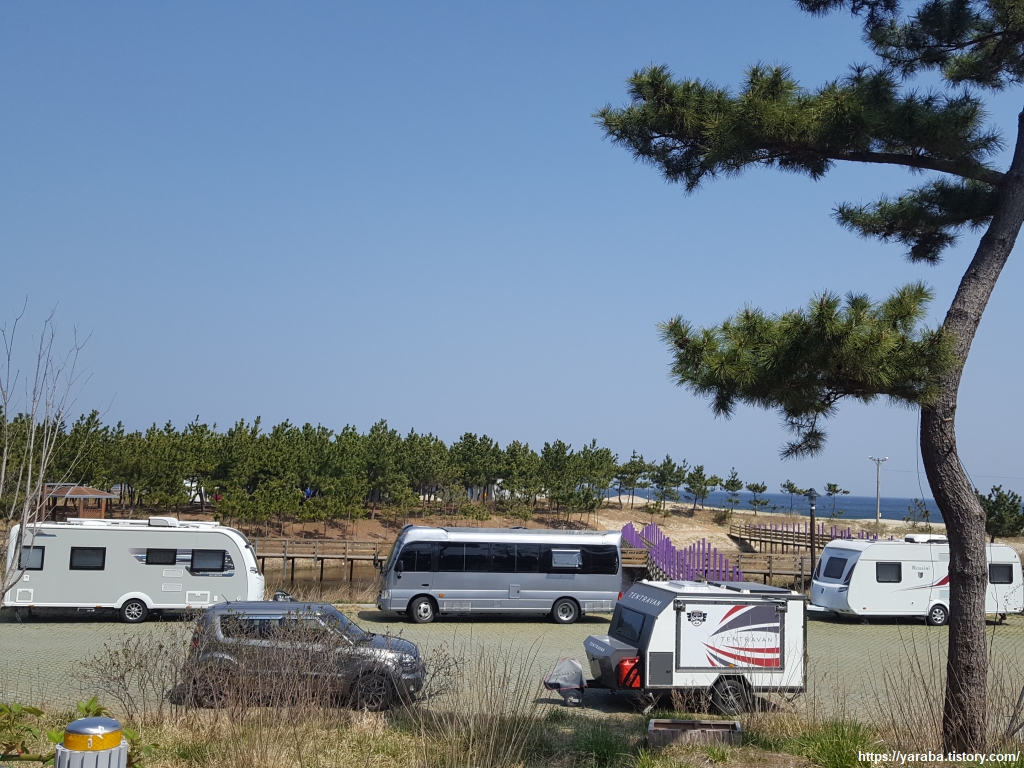망상 오토 캠핑장을 지나는 길, 넓은 해변답게 유료 캠핑장이 아니더라도 해수욕장 바로 뒤로 넓은 주차장을 사용할 수 있다. 주차장을 가로질러 간다.