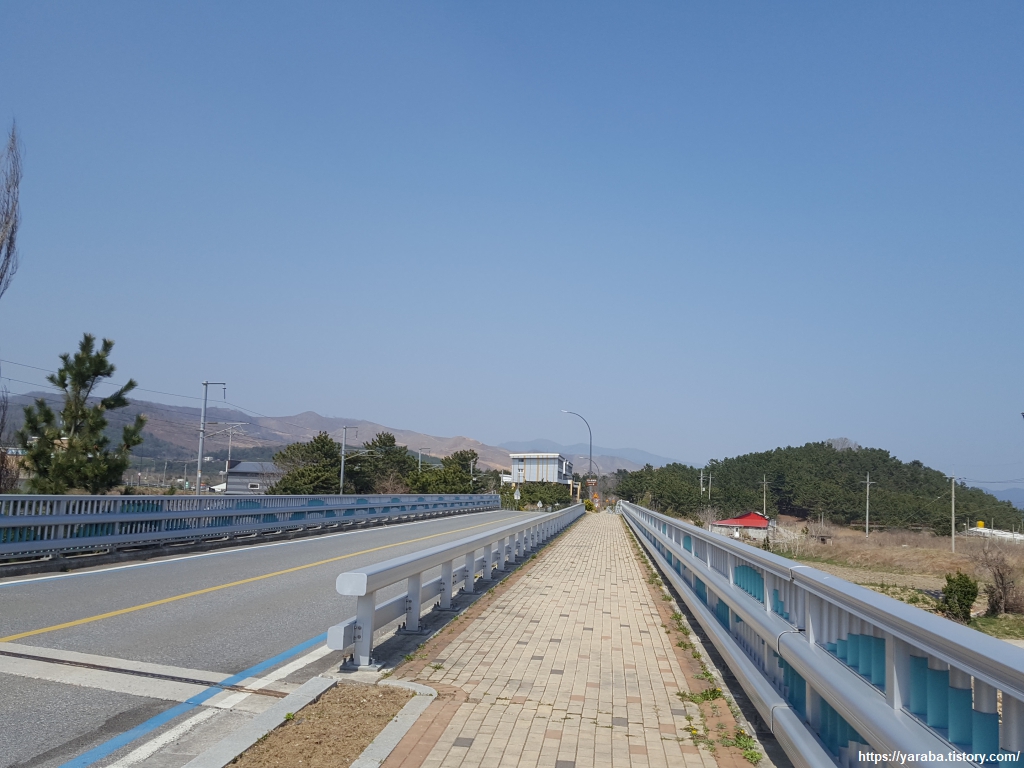 작은 어선들이 정박해 있는 대진항을 지나서 대진항 입구에 널찍하게 마련되어 있는 광장에서 잠시 쉬어 간다. 작은 공연장처럼 해가림이 있는 공간이었는데, 서퍼들이 많이 찾는 대진 해변인 만큼 서퍼들을 위한 교육 공간으로 활용하겠다 싶었다.
