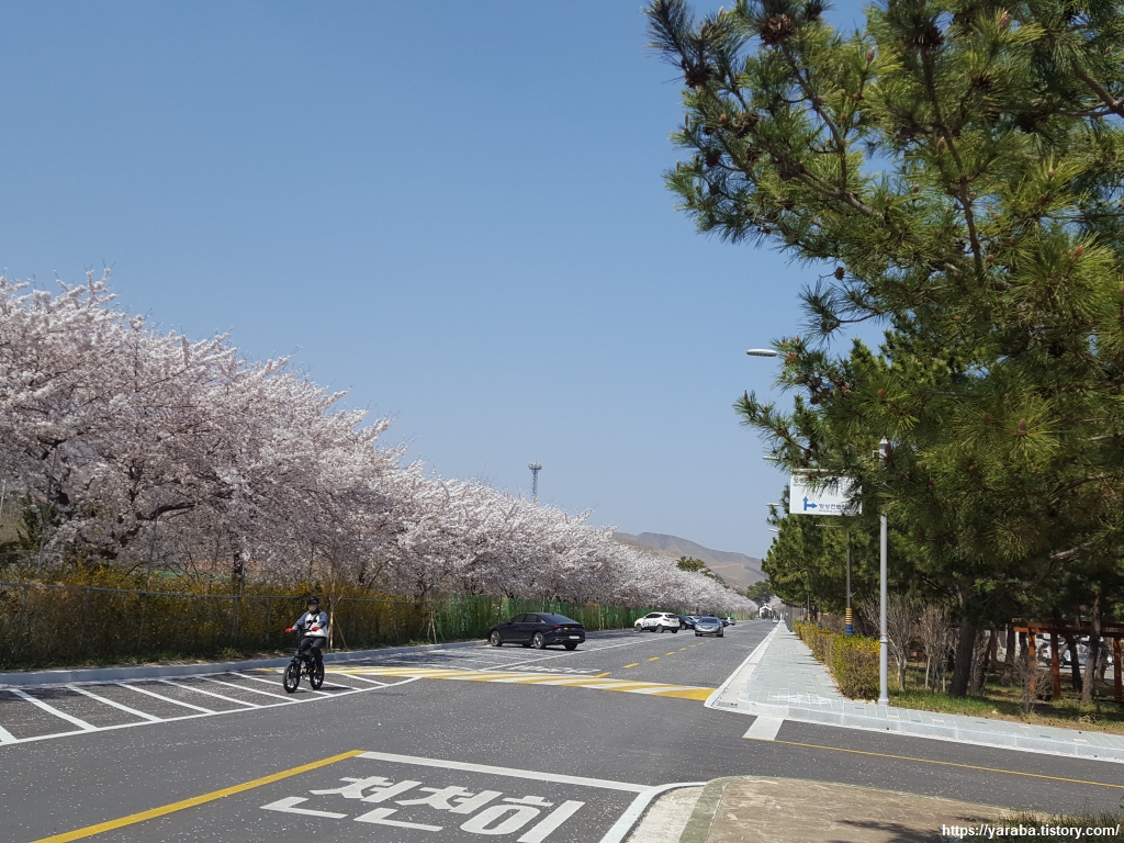 전시관 뒤쪽으로 나오니 이곳은 벚꽃 축제가 벌어지고 있었다. 지난주 해파랑길을 걸으며 일주일 후에는 벚꽃이 절정이겠구나 하며 기대를 가지고 일주만에 다시 동해를 찾은 것인데 이곳에서 벚꽃 축제를 벌이게 되었다. 육지에서 바다로 부는 강한 바람 덕택에 꽃잎에 따귀를 맞는 호사를 누리는 길이었다.