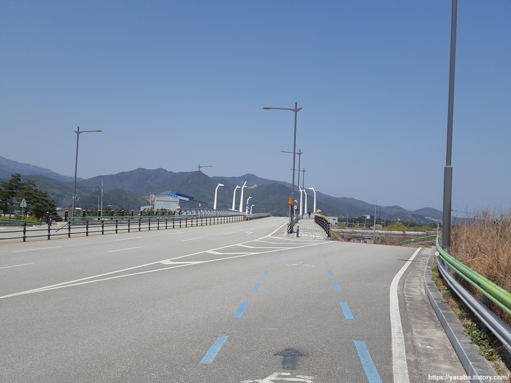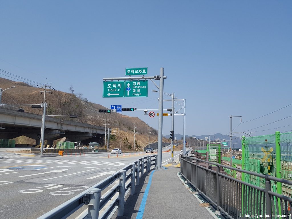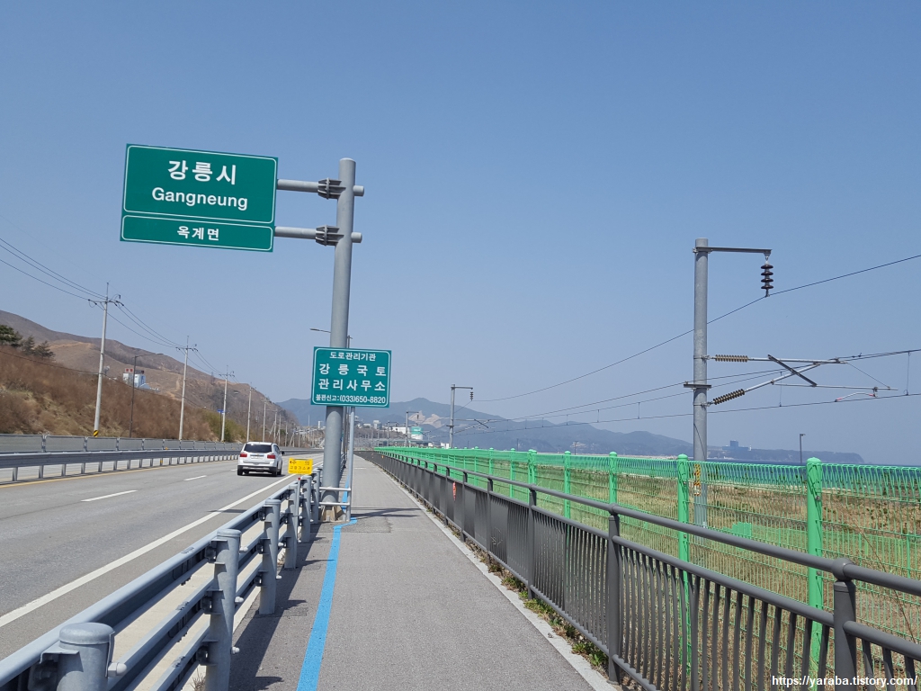 망상 오토캠핑 리조트 앞에서 좌회전하면 동해선 철로 아래를 지나서 7번 국도변으로 길을 이어갈 수 있다. 자전거길과 함께하는 길이다.