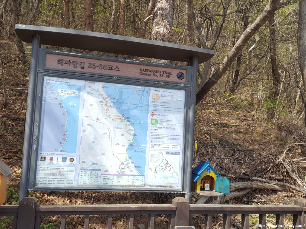 괘방산 등산로 입구에서 오늘의 긴 여정을 끝낸다. 내일은 이곳에서 해파랑길에서 가장 어렵다는 36코스를 걸을 예정이다. 무릎이 잘 버텨 줄지 걱정 반, 얼마나 좋은 풍경을 만날까 기대 반이다.