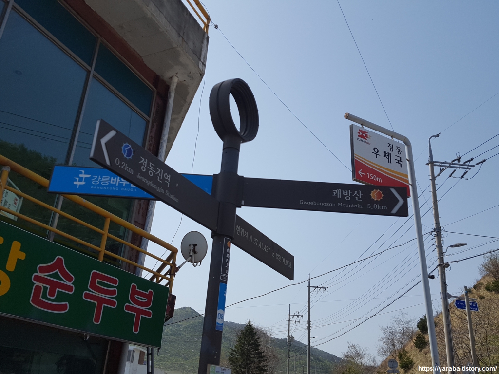 레일바이크 매표소 앞에서 좌회전하여 골목길을 빠져나가면 정동진 버스 정류장을 지나 괘방산 등산로 입구에 닿는다.
