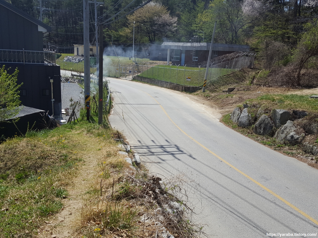 산책길을 내려가면 언별 1리에서 강릉 차량 기지로 이어지는 언별 하평길 포장도로를 만난다. 길 바로 앞에 있는 전원주택에서는 솥단지를 걸고 무언가를 끓이고 있었다. 장 가르기 하는 시기인 만큼 간장을 끓이고 있지 않을까 하는 추측을 해본다. 집에 가면 할 일에 대한 그림도 그려진다. 포장길을 가로질러 산길로 다시 들어간다.