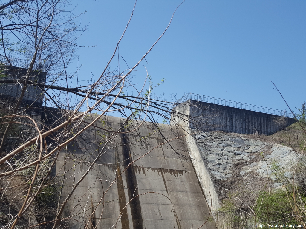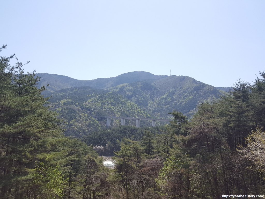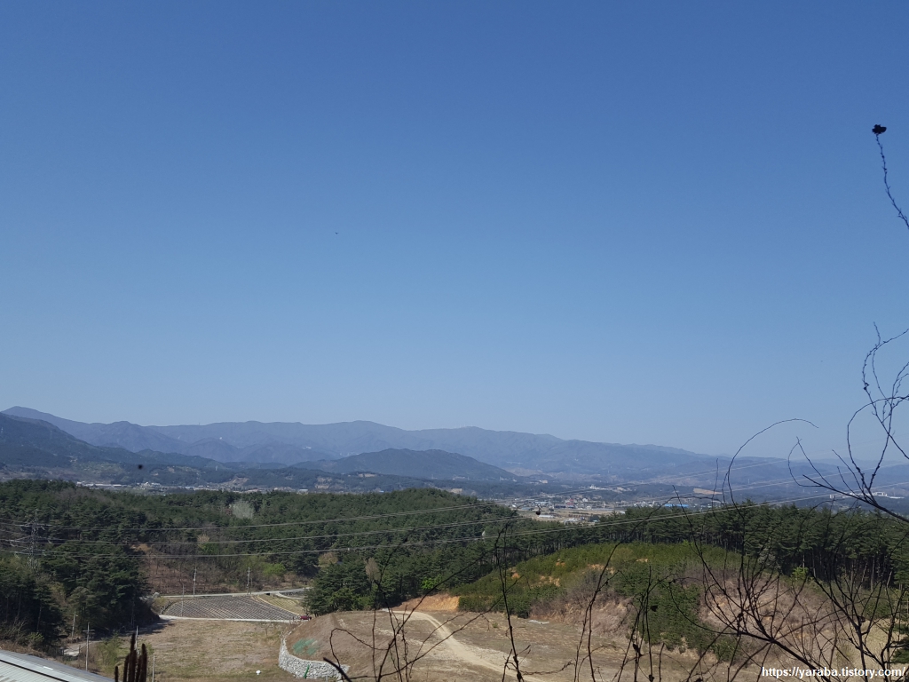 능선이 북쪽 가장자리를 걷자, 송전선 너머로 덕현리의 전경이 눈에 들어온다. 지금 까지는 강릉시 강동면이었지만 이제는 구정면이다. 차량 기지도 보이는 듯하다.
