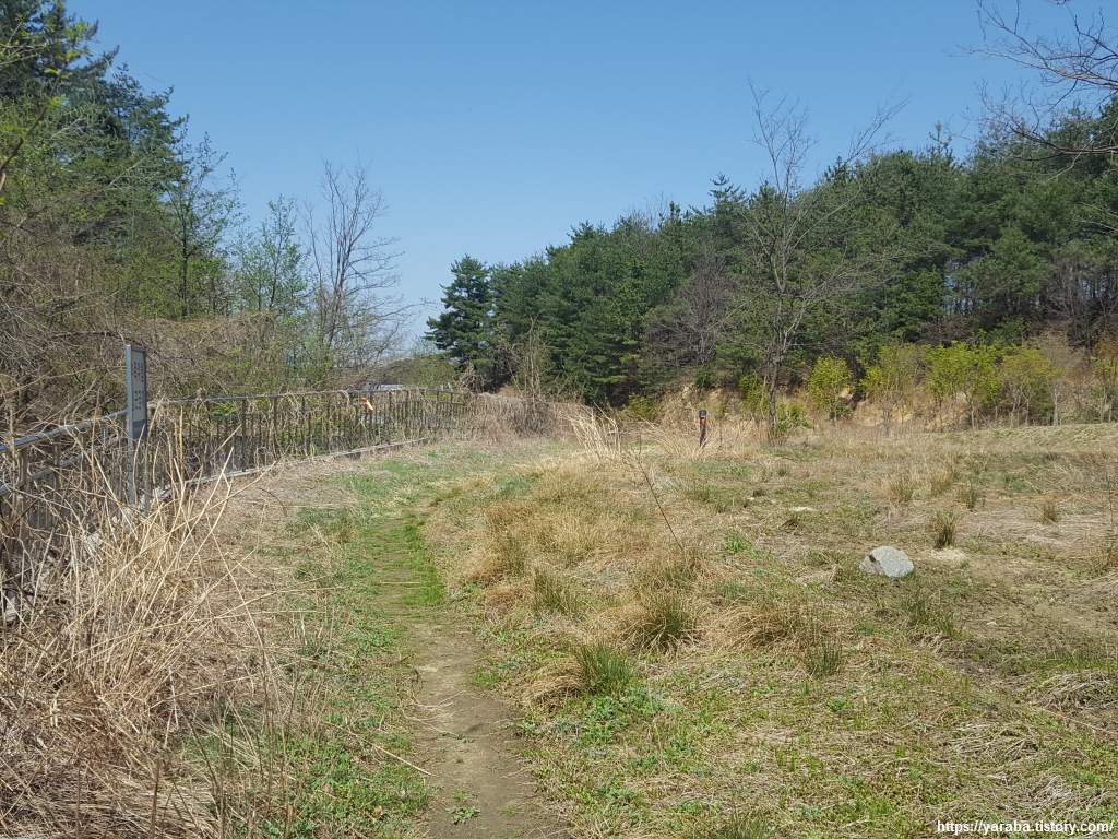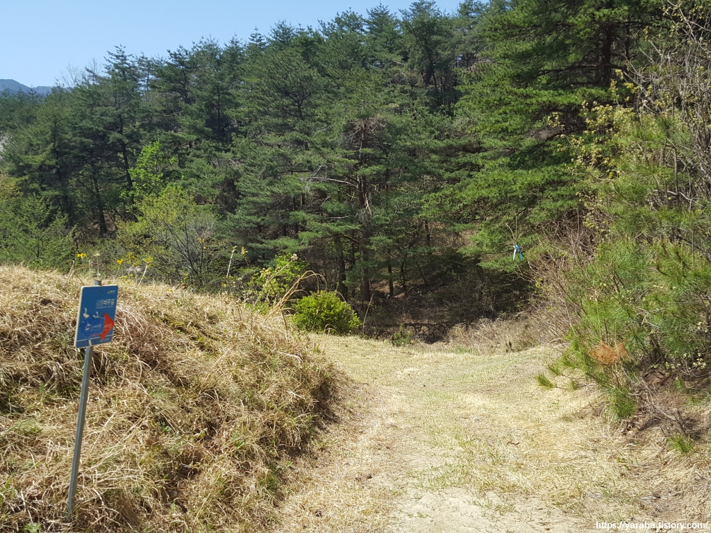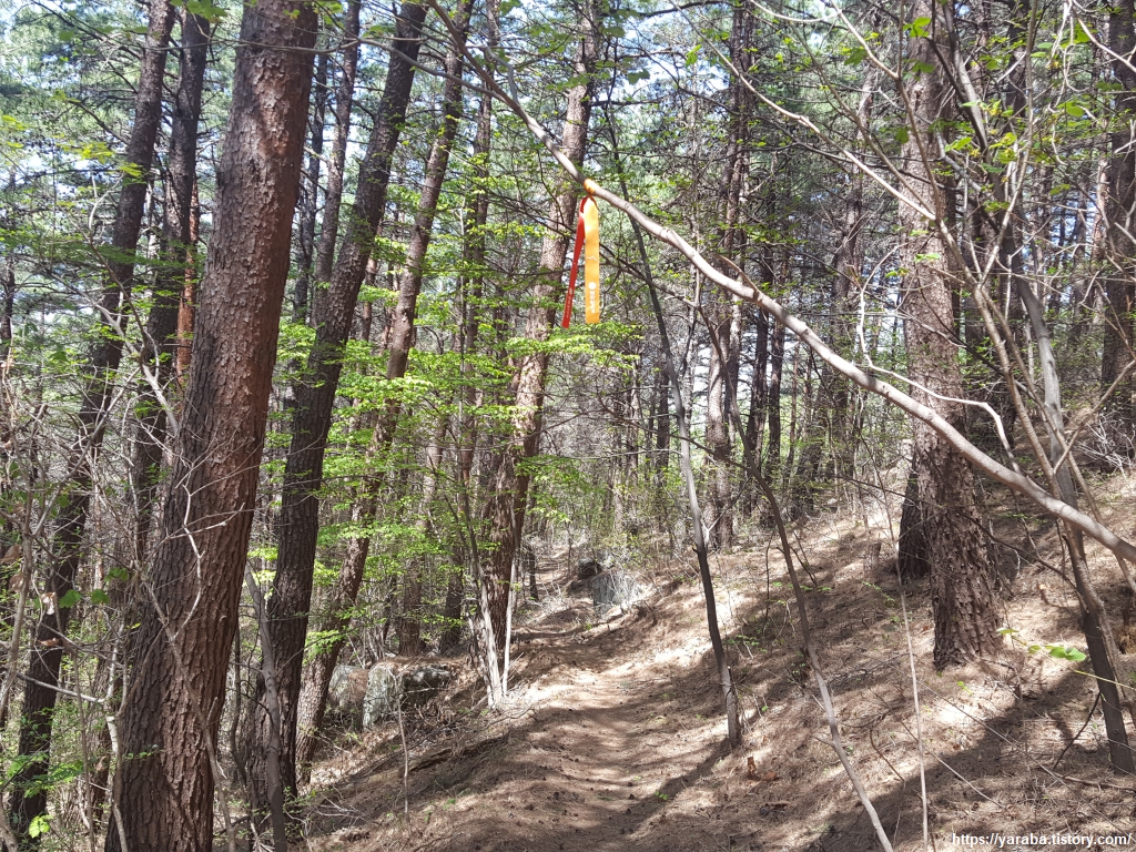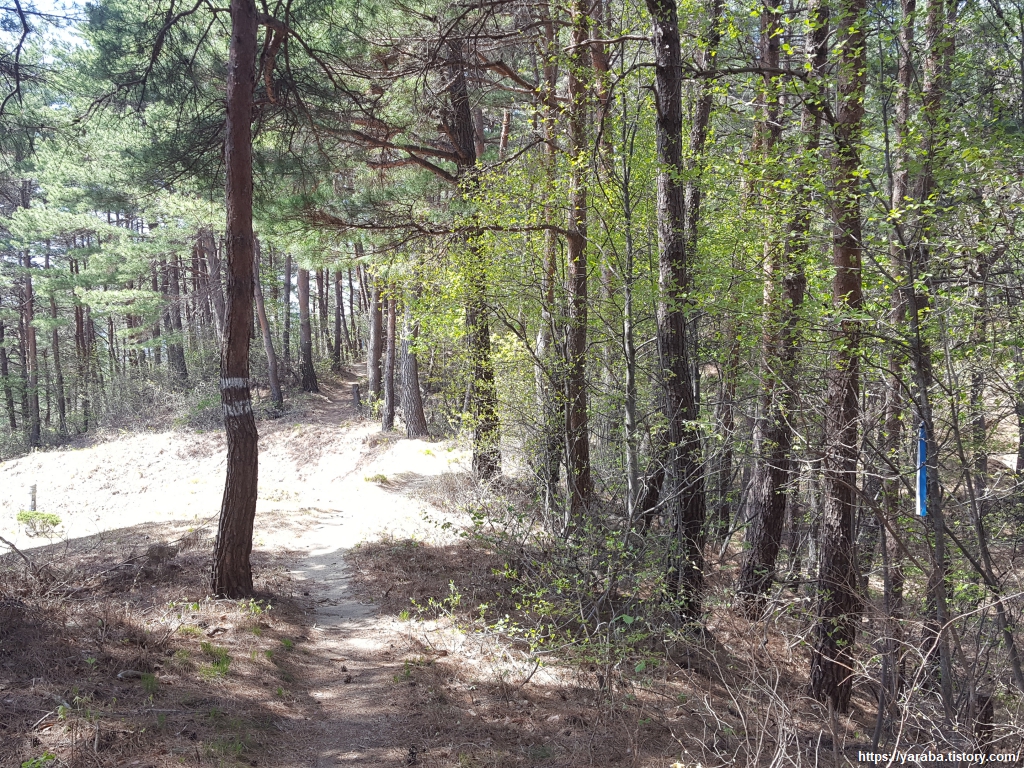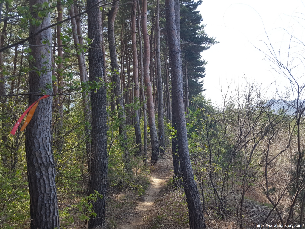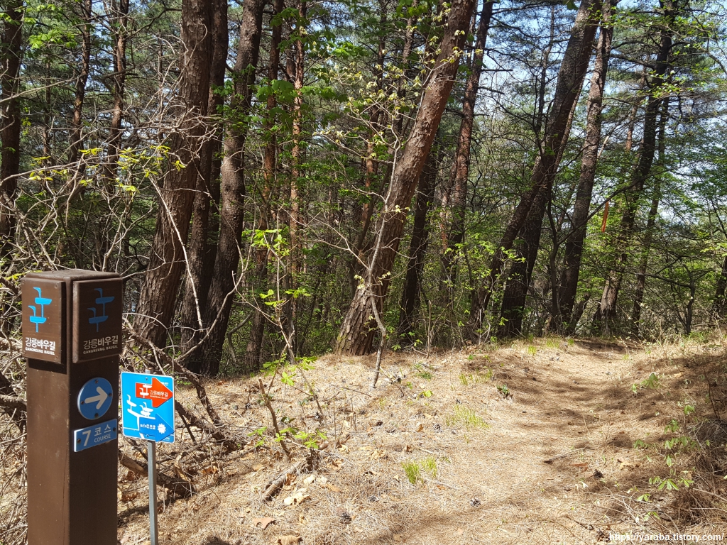 강릉 바우길 표지판과 리본을 따라서 길을 이어간다. 산 능선의 남쪽 가장자리를 걷는다.