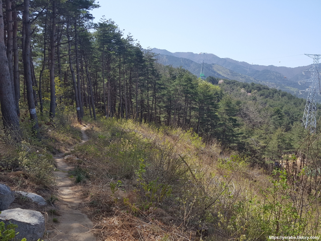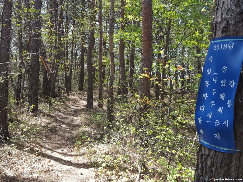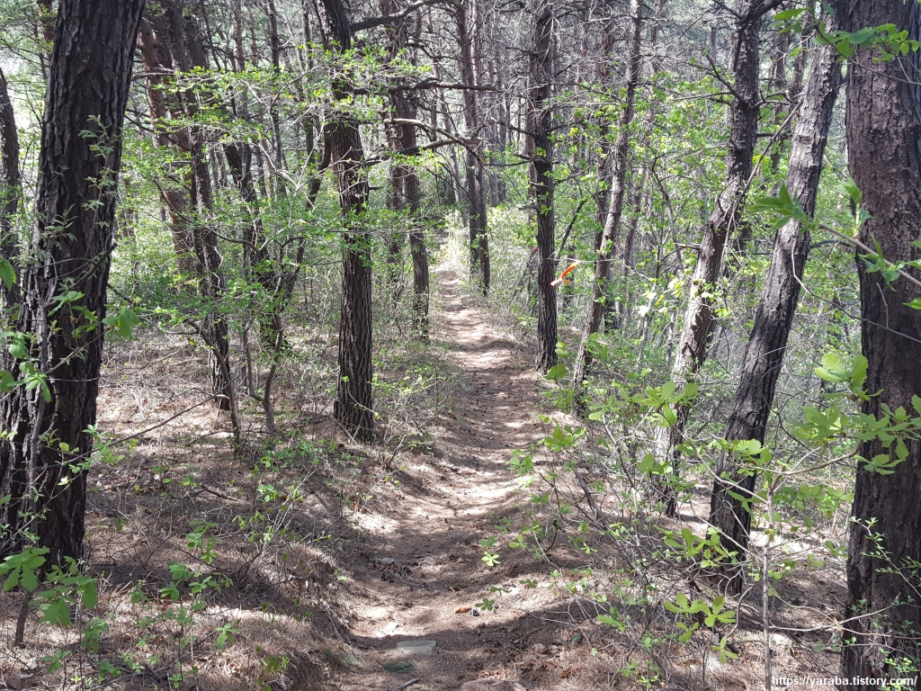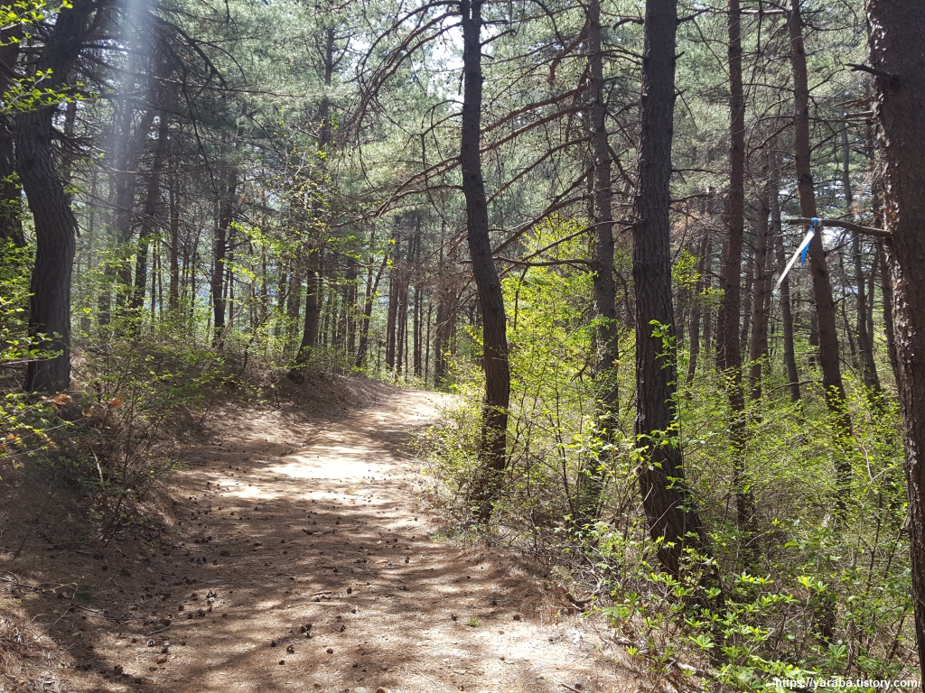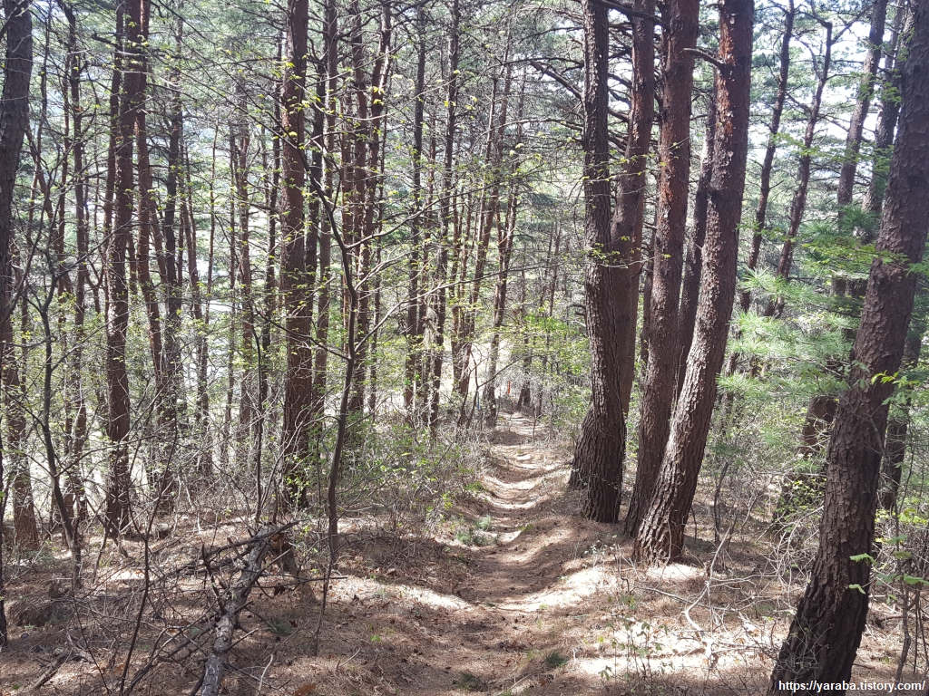 빽빽한 소나무 숲길을 따라 본격적인 하산길에 접어든다. 정감이 마을 등산로에서 시작한 길었던 숲길이 끝나간다.