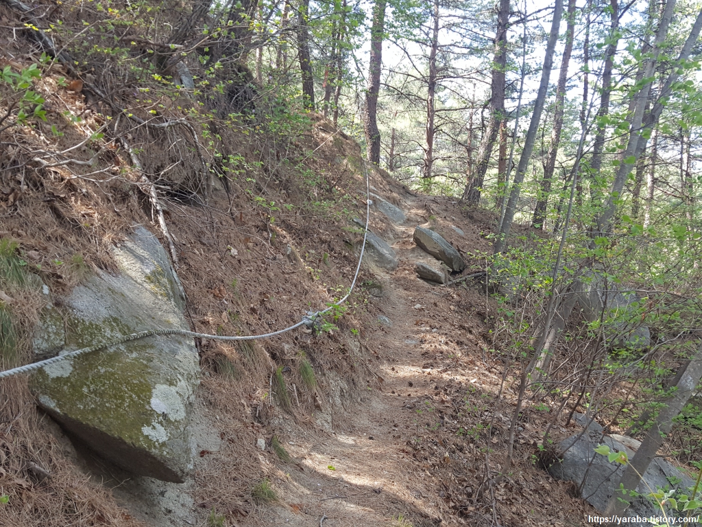 낮은 뒷산에 웬 밧줄이지? 하는 광경이지만 바위 때문에 가파른 지역이라 밧줄을 매어 놓은 모양이다.