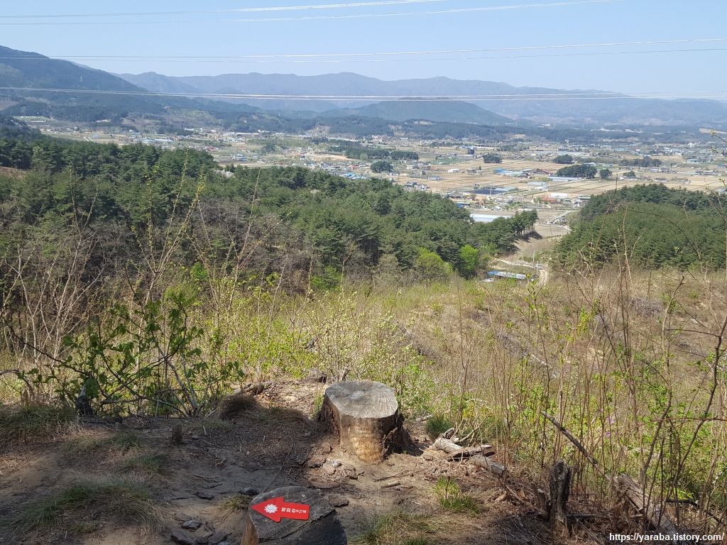 북쪽 가장자리에서 보는 덕현리 방면의 전경이다. 나무 그루터기에 붙여놓은 해파랑길 표식에 미소가 지어진다.
