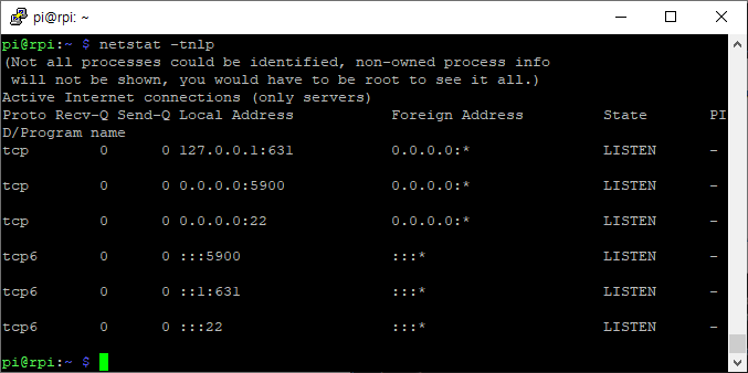 "netstat -tnlp" 명령으로 현재 시스템에서 수행 중인 서비스들을 확인할 수 있는데 22번 포트가 SSH이고 5900번이 VNC 서버이다.