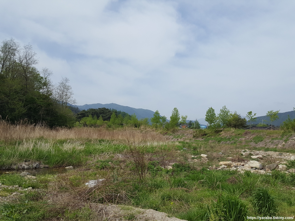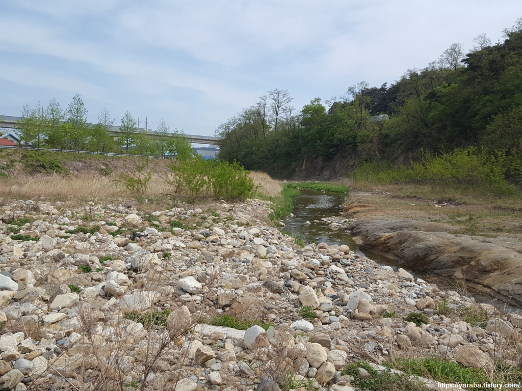 섬석천을 건너면서 바라본 상류 쪽과 하류 쪽의 모습이다. 그야말로 자연 그대로의 생태 하천이다. 상류로 따라 올라가면 강릉 솔향 수목원이 있다. 하류 쪽으로 보이는 다리는 서울과 강릉을 잇는 경강선 철로가 놓인 다리다. 어제 KTX 이음을 타고 저 다리를 건넜던 것이다. 하류로 내려가면 조금 있으면 만나게 될 장현 저수지를 만난다.