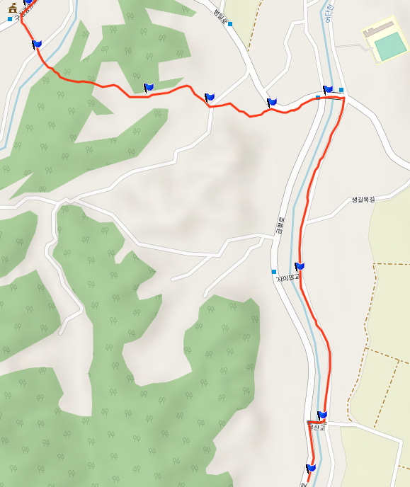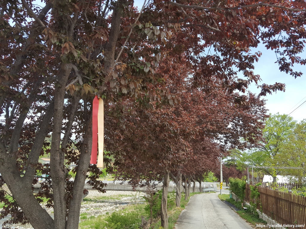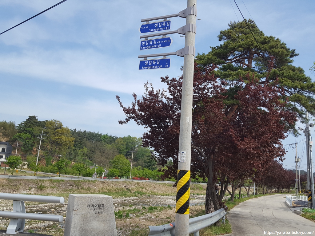 사이말교라는 이름의 다리가 있는 갈림길에서 길은 자엽 자두나무들이 붉은빛을 뽐내는 하천변 길로 계속 직진한다. 다리 이름도 사이말교로 독특하고 길 이름도 생길목길로 독특하다. 생길목이라는 마을이 있어서 붙은 길 이름이란다.