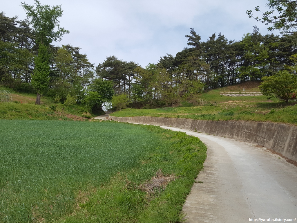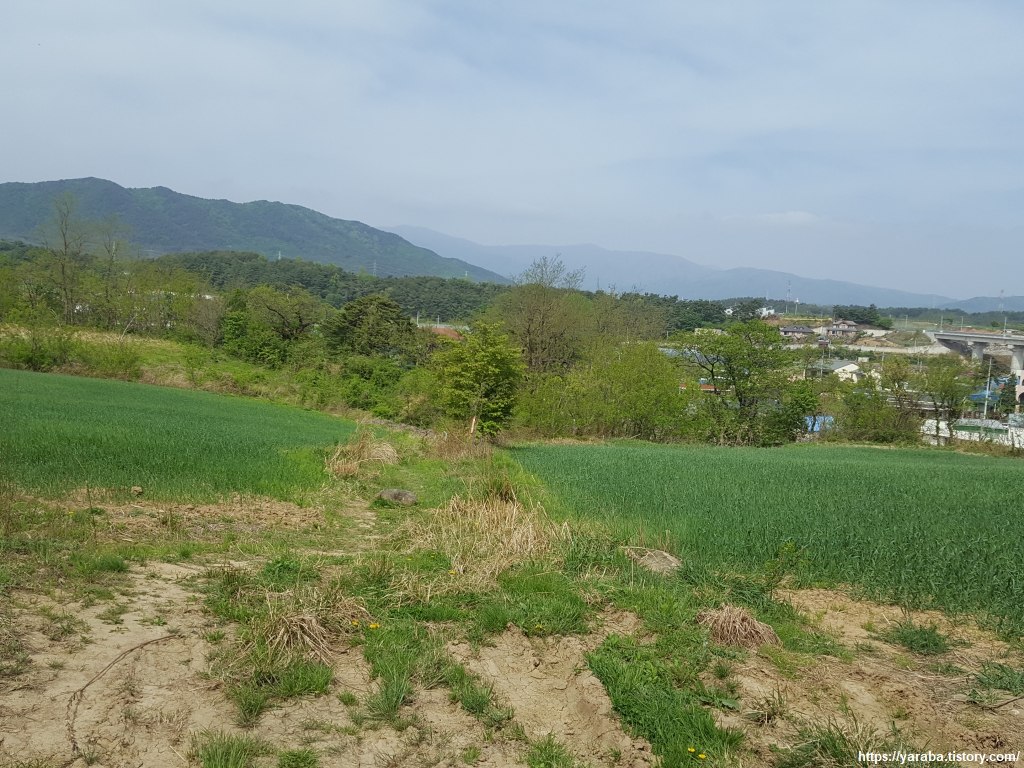 마을 언덕을 넘어서면 구정면 여찬리의 전경이 눈에 들어온다. 멀리 서울로 이어지는 경강선 다리도 보인다. 밭 사이의 길로 언덕을 내려간다.