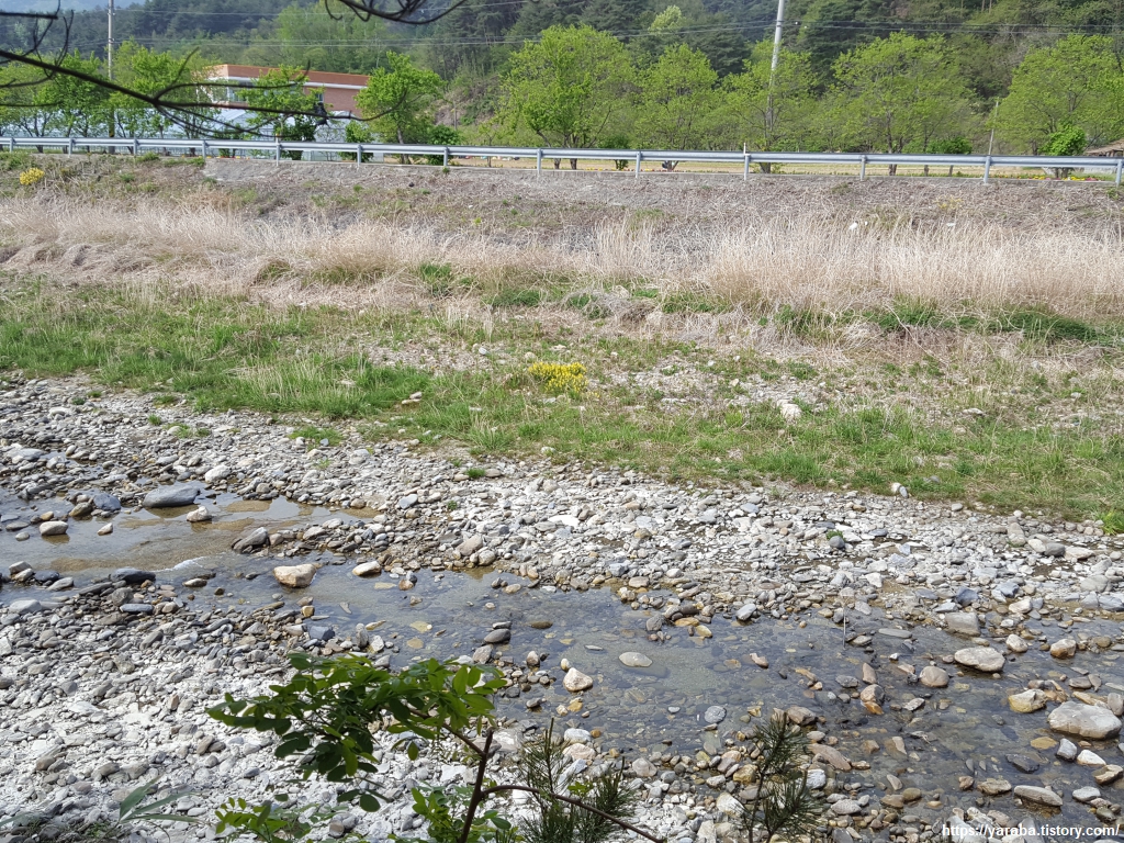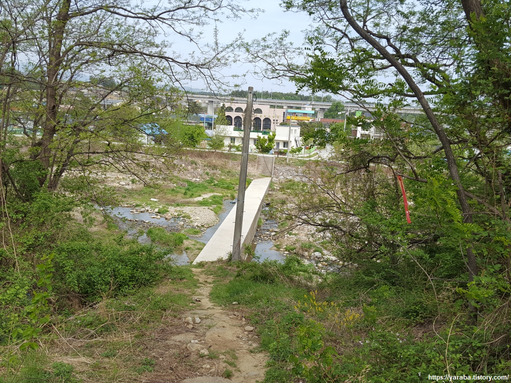 언덕을 내려가면 섬석천을 만나는데 하천을 가로질러 설치된 보 위를 걸어서 섬석천을 건넌다.