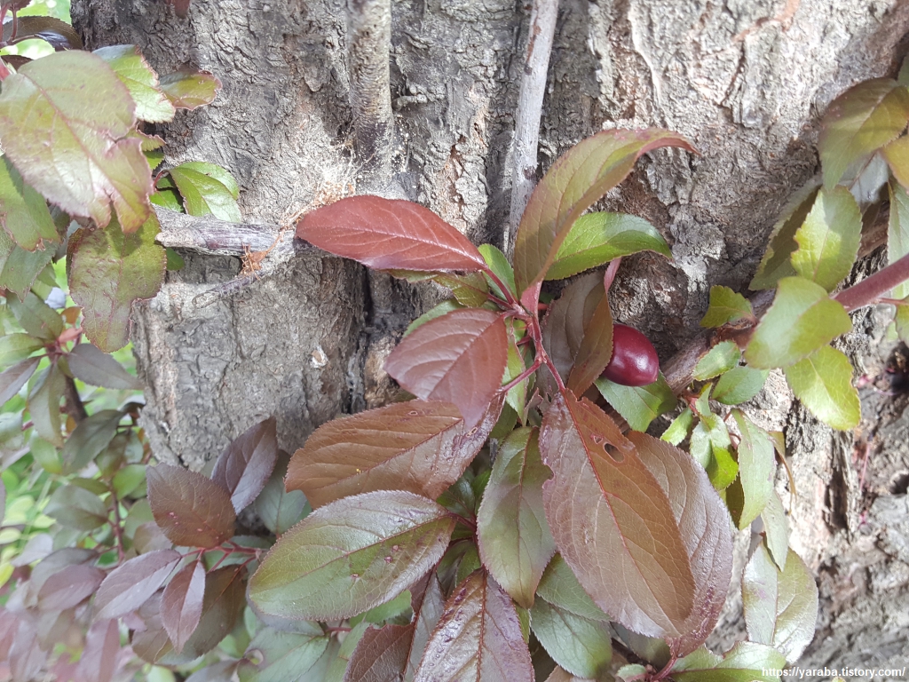 나무 밑동에 잎을 내고 꽃을 피우고 자줏빛 열매까지 내었다, 사람 입장에서는 "너는 그곳에 있으면 안 돼! 높은 가지에 있지, 어쩌다 여기에 있게 된 거야?" 하며 혀를 끌끌 찰 수도 있겠지만, 나무는 "자리가 뭔 상관이래요! 넘치는 에너지를 주체할 수 없다 보니 이런 자리에서도 꽃을 피우고 열매를 맺게 되었네요. 누가 압니까? 이 자리에서 맺은 열매가 키 작은 꼬마에게는 최고의 선물이 될지도 모르는 것 아닙니까?"라고 대꾸하는 것 같다. 일반 자두는 풋열매일 때는 초록색이다가 열매가 익으면 자줏빛으로 바뀌지만 자엽 자두나무의 열매는 처음부터 자줏빛이다.