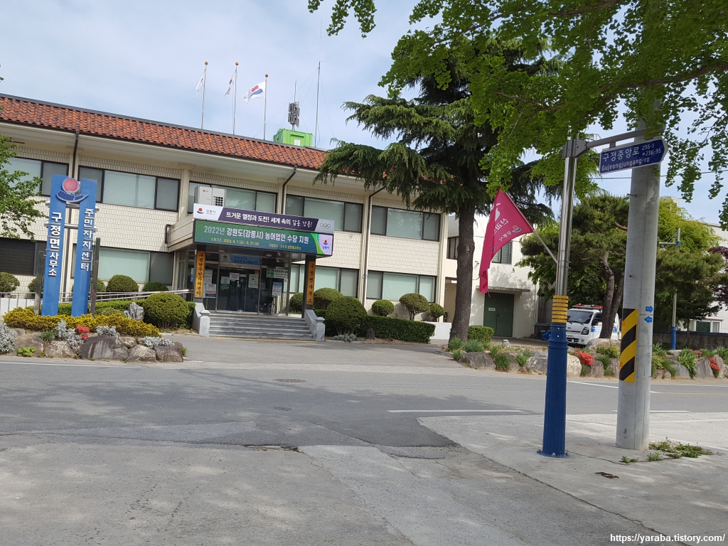 섬석천을 건너 마을길을 지나면 구정면 사무소에 도착한다. 해파랑길은 면 사무소 앞에서 우회전하여 이어간다.