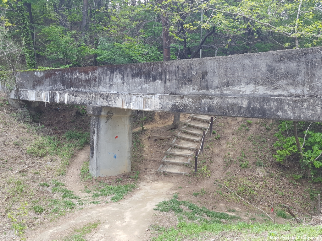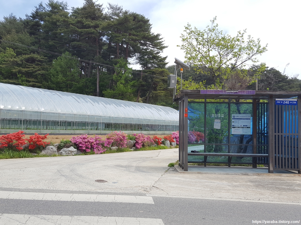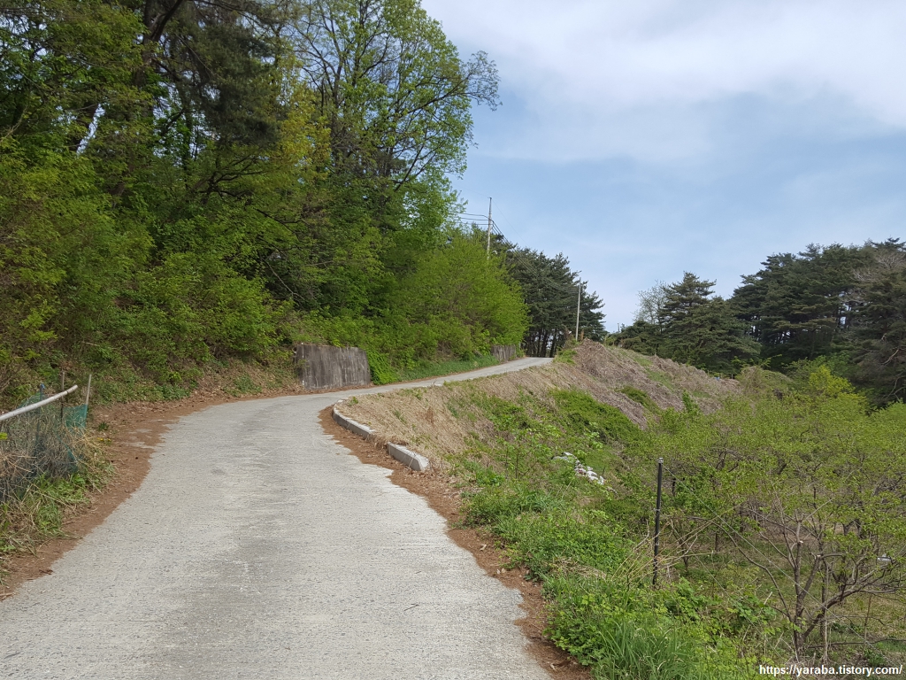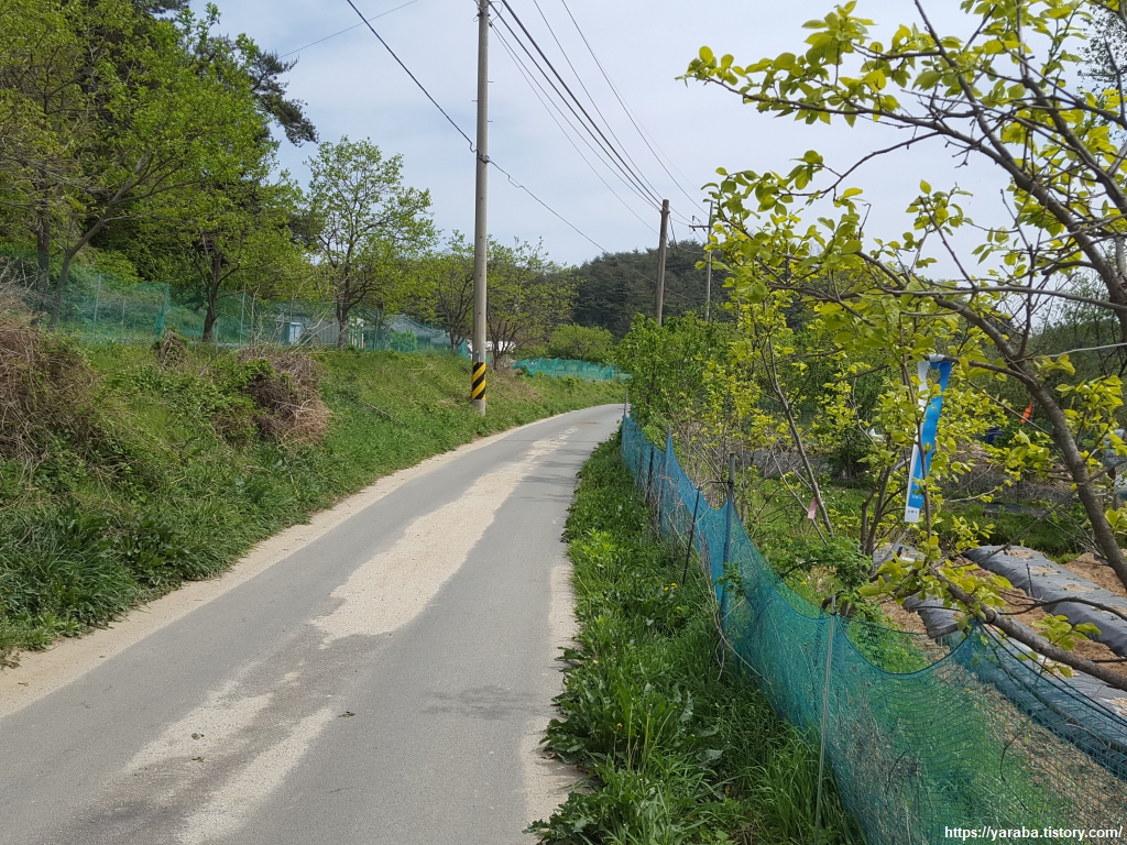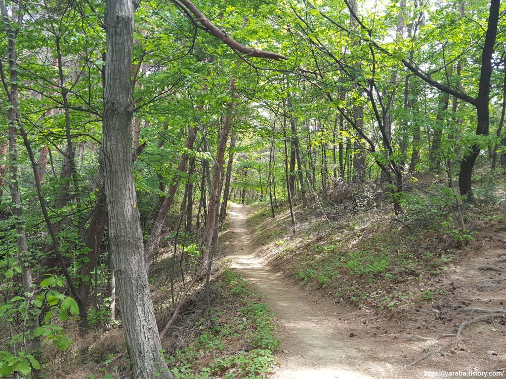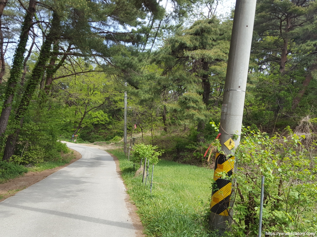 숲 속으로 들어오는 잔잔한 햇빛이 아름다운 길이다. 참 좋은 숲길이다!라는 감탄은 얼마 가지 않아 모산로 도로와 만나면서 끊어진다.