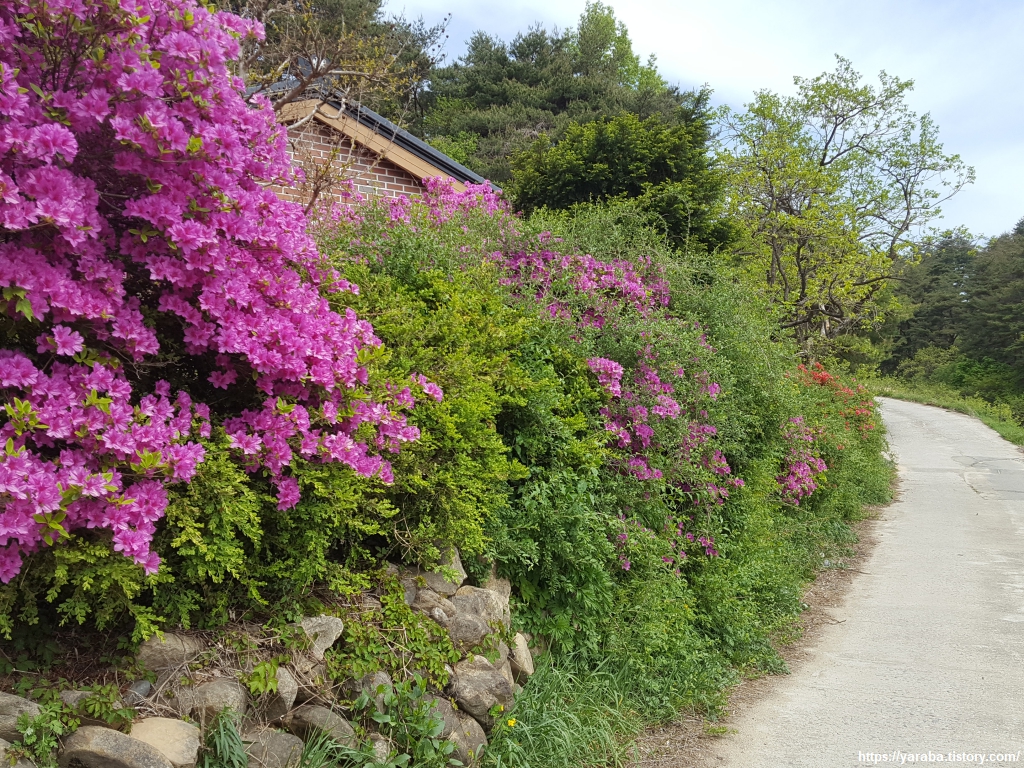 길을 지나는데 한 주택의 울타리 나무들이 꽃잔치를 펼치고 있었다. 꽃의 왕이라는 모란이 자태를 뽐내고 있고, 그 옆으로는 철쭉이 마치 신하처럼 분위기를 북돋아 주고 있다. 여느 식물원 못지않다. 이런 것을 두고 걷는 길에 얻는 횡재라 해도 되지 않을까?