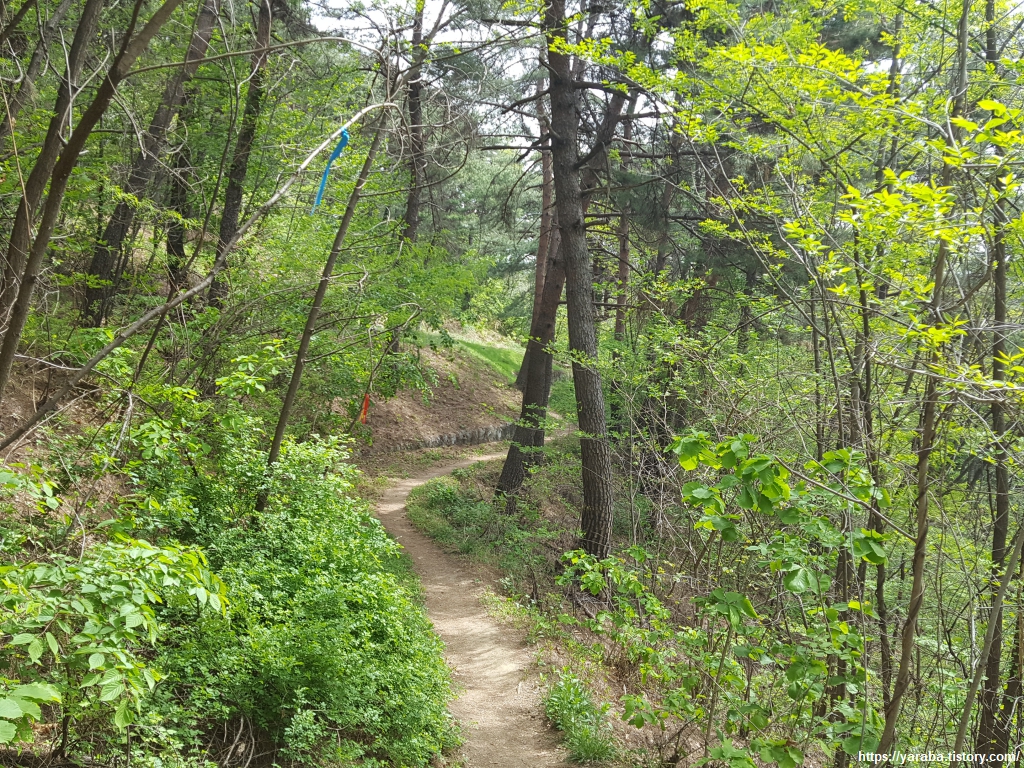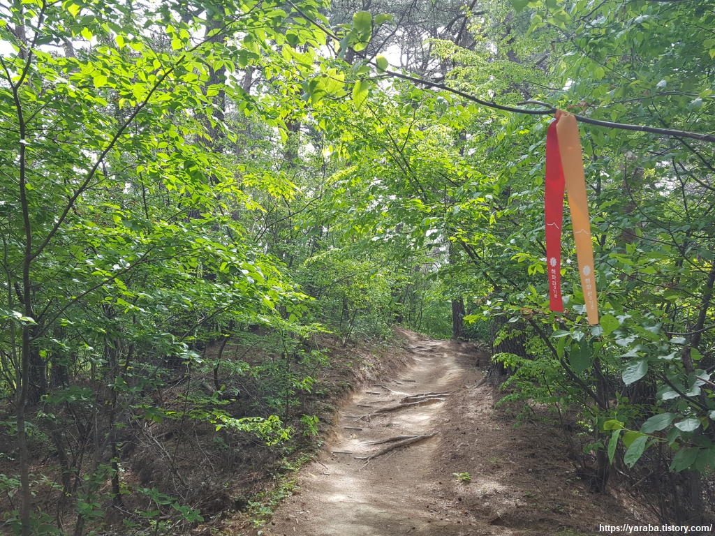 때로는 소나무 숲이, 때로는 활엽수 숲이 모산봉으로 가는 길을 맞아 주는 오르막길이다. 105미터의 높지 않은 모산봉이지만 경사가 조금은 급한 편이라 머리로 땀이 흐르는 것을 막을 수 없다.