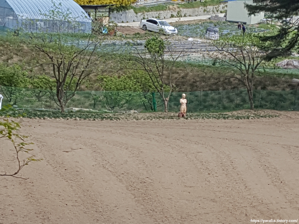 소나무 한 종류만 있는 숲이 아니고 작은 나무들도 어우러진 숲이라 더욱 매력적이었다. 인기 있는 산책로답게 산책을 즐기는 사람들도 많았다. 산 옆으로 땅을 갈아 놓은 밭에는 벌거벗은 마네킹이 허수아비 역할을 하고 있다. 처음에는 대체 저게 뭐지! 하는 궁금증이 있었다. 자세히 보니 마네킹이었다. 야생동물들은 저 허수아비에 과연 반응할까 하는 호기심도 생겼다.