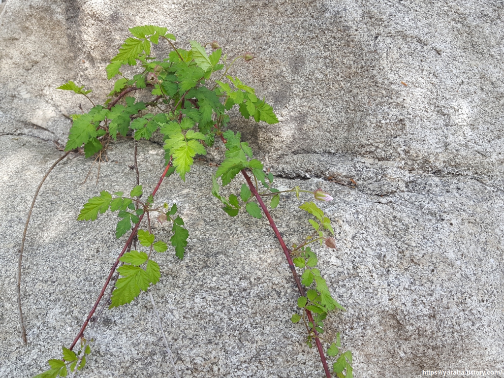 저수지 한 모퉁이에서 호수를 바라보며 잠시 쉬어간다. 호수가 주는 나름의 풍경 속에서 평화로운 시간을 누린다. 휴식 후에 몸을 추스르는데 바위틈에 뿌리를 내린 식물이 눈길을 사로잡는다. 붉은 줄기에 가시가 돋친 것이 딸기 종류가 아닌가 싶었는데 꽃 모양은 딸기 종류와는 거리가 멀어 보인다. 바람에 씨가 날아왔는지, 아니면 새가 먹은 열매의 잔재가 발아했는지 모르겠지만 대단한 생명력이다.