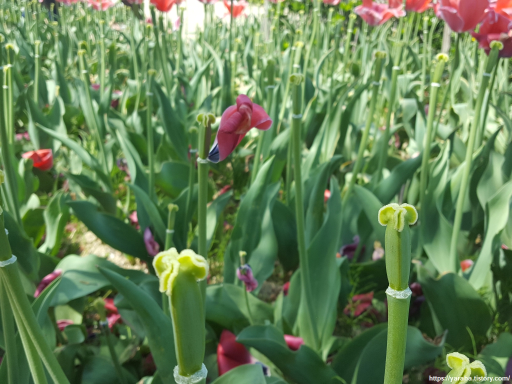 경포천 옆길을 걷다 보면 경포호 주위를 걷는 길과 다시 만난다. 경포호 튤립 공원이다. 가을에 구근을 심어 3~5월에 꽃을 피우는 튤립도 꽃이 지기 시작하는 모양이다.